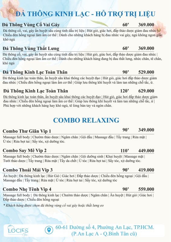 BẢNG GIÁ ĐẦY ĐỦ CÁC DỊCH VỤ TRỊ LIỆU TẠI LOCIES SPA